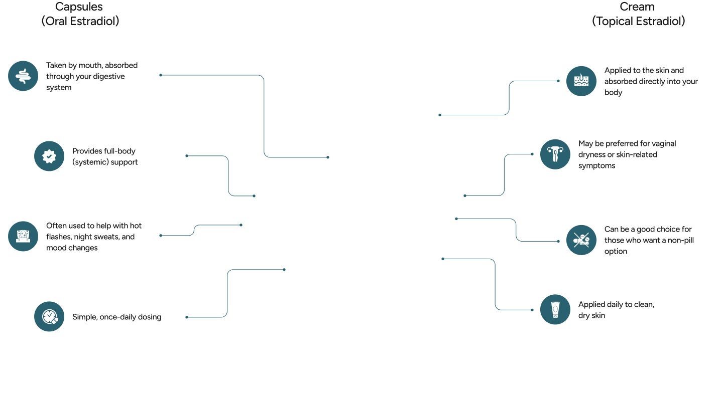Estradiol is a form of estrogen that replaces the hormone your body loses during menopause, which helps relieve menopausal symptoms. We offer estradiol in different forms, such as a daily oral capsule or a topical cream applied to the skin.